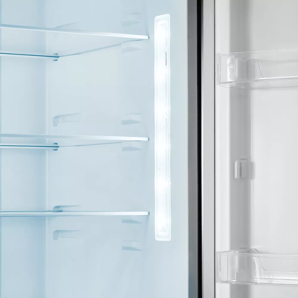 За равномерное распределение холода отвечает динамическое охлаждение: специальный вентилятор поддерживает оптимальные условия на каждой полке и в любом отделении. Внутреннее пространство продумано для гибкой настройки — высота полок и отсеков регулируется, полки выполнены из закаленного стекла, а комплектация включает подставку для яиц и форму для льда.