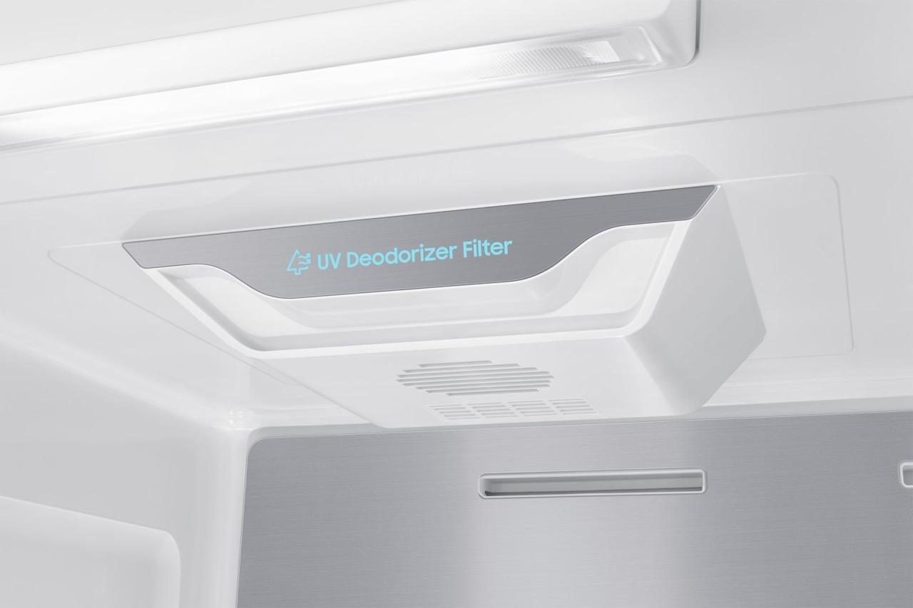 Управление осуществляется как с внутренней электронной панели, так и дистанционно через приложение SmartThings с поддержкой Wi-Fi и Bluetooth. В холодильной камере — 4 полки из закаленного стекла (с фиксаторами против выдвижения), 5 дверных карманов, полка для бутылок и 2 ящика для овощей и фруктов. В морозильной камере — 4 полки, 5 дверных карманов и 2 прозрачных пластиковых ящика. Обе камеры оснащены светодиодным освещением и индикацией температуры.
