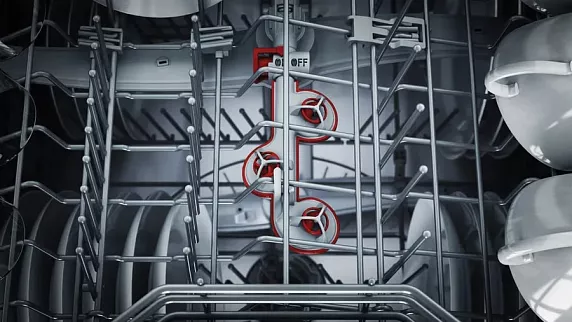 Машина рассчитана на 13 комплектов посуды, что делает её отличным выбором для семьи. Гибкость загрузки обеспечивают 3 корзины, включая верхнюю с системой Rackmatic-3 для регулировки по высоте и удобную корзину для столовых приборов внизу. 8 программ охватывают все потребности: от быстрой мойки (30 минут) до интенсивной для сковородок с опцией IntensiveZone или деликатной для стекла. Технология Zeolith® обеспечивает эффективную сушку благодаря натуральному минералу, выделяющему тепло. Для полной безопасности предусмотрена полная защита от протечек AquaStop и блокировка от детей.
