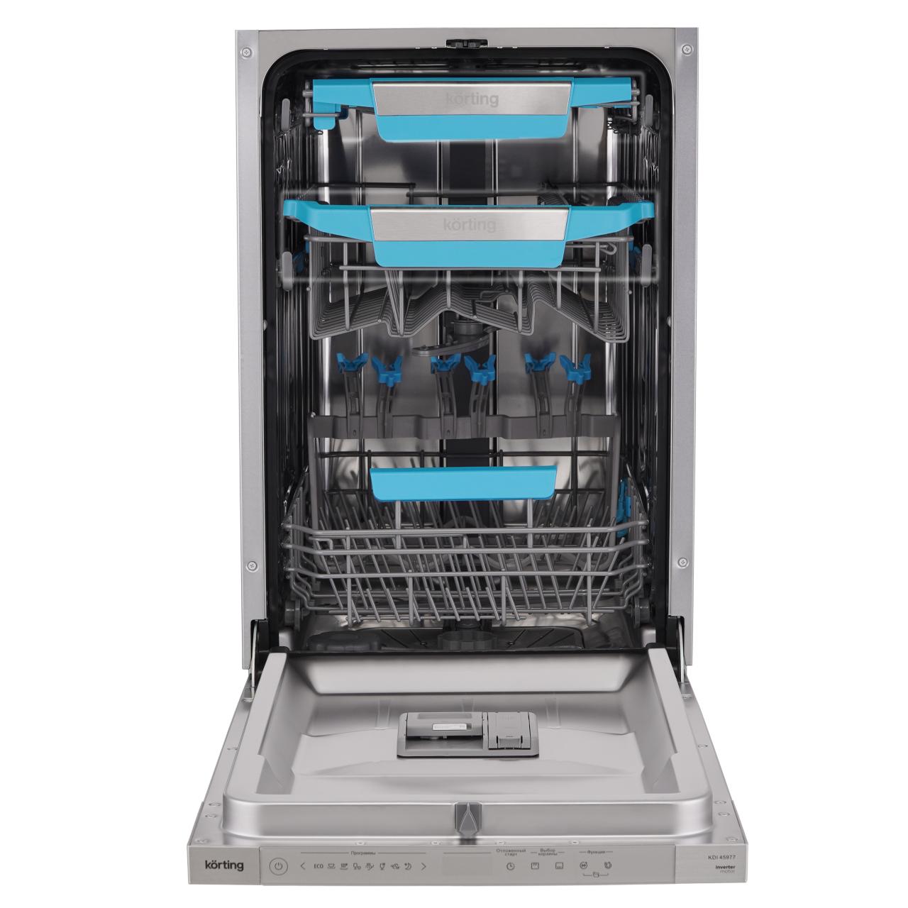 Встраиваемая посудомоечная машина Korting KDI 45977 представляет собой уникальное сочетание стильного дизайна и передовых технологий. Серебристая панель управления и внутреннее освещение LED придают ей современный и элегантный вид.